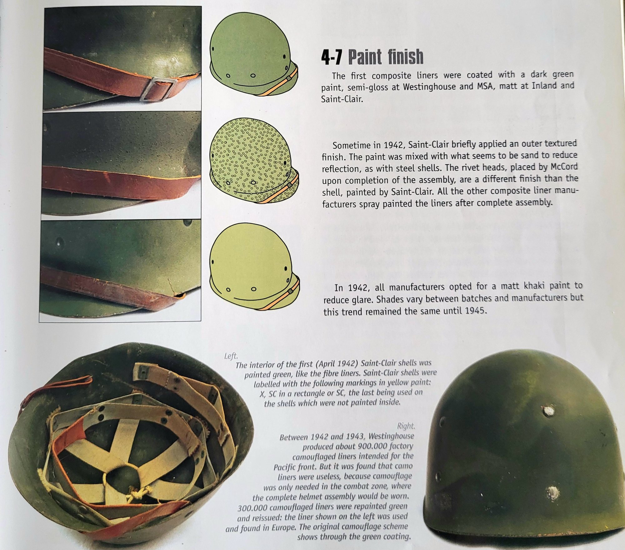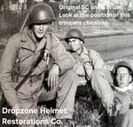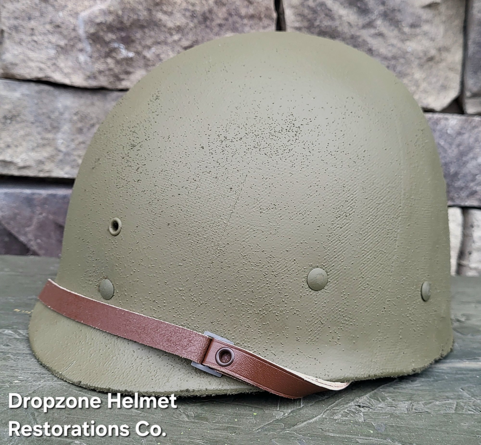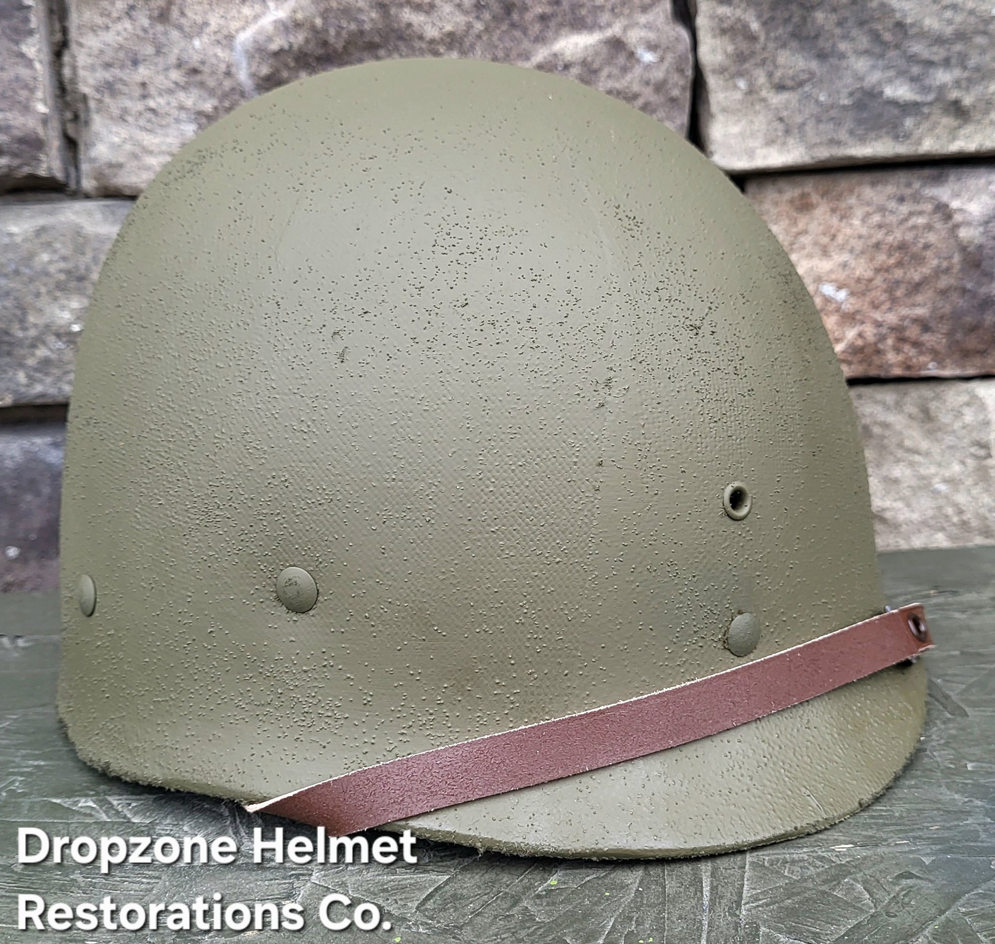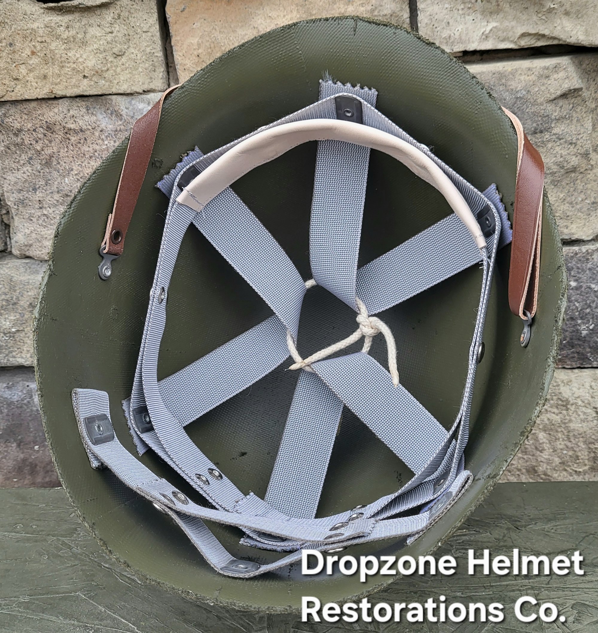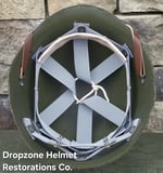 Repro WWII Saint Clair M-1 Helmet liner. Complete with Rayon webbing, fixed liner strap, Rayon sweatband and rayon nape strap. It is stamped "LINER FIBRE M-1" and a "G" in the crown. Rayon webbing Kit & fixed liner strap are from "Jmurrayinc1944.com".