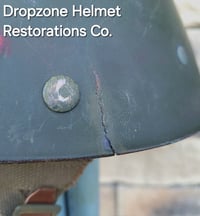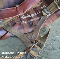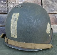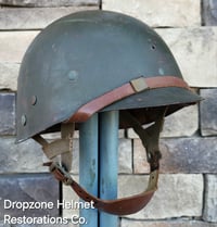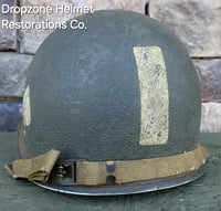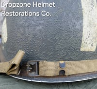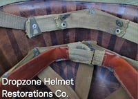 LINER: This is a WWII Era Firestone liner that has been restored as an Airborne model. Original HBT webbing, Original A-washers, Original Sweatband & original nape strap. The A-yokes w/cast buckles, liner strap & chamois lined leather chincup are premium aged repro's. ***The Drawstring helmet net & burlap scrim are included.***