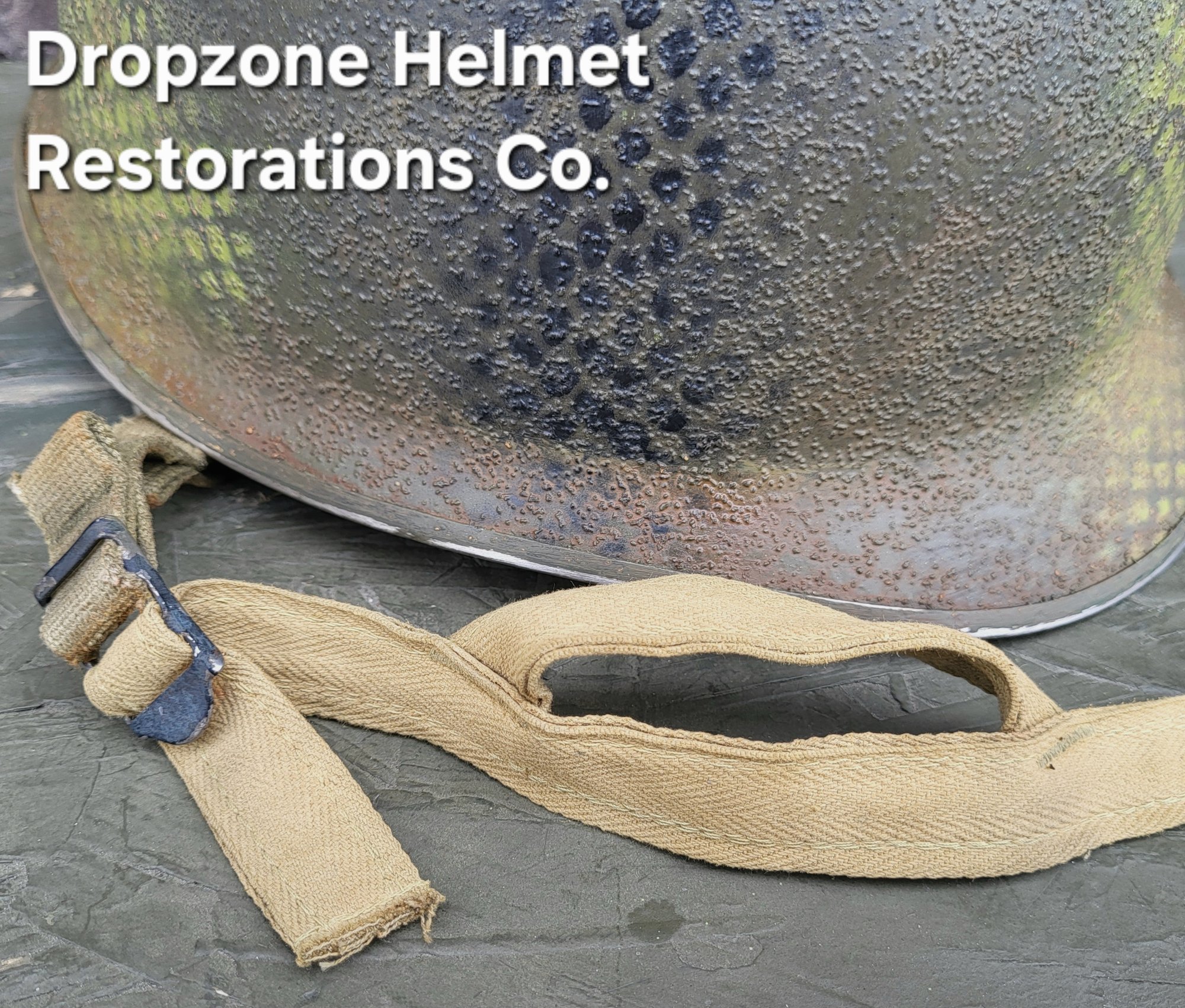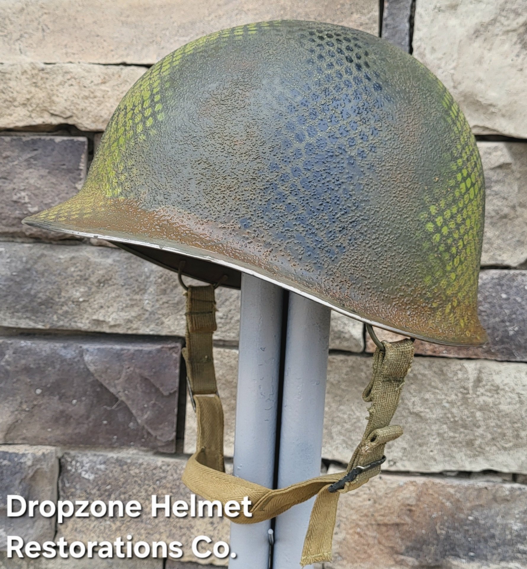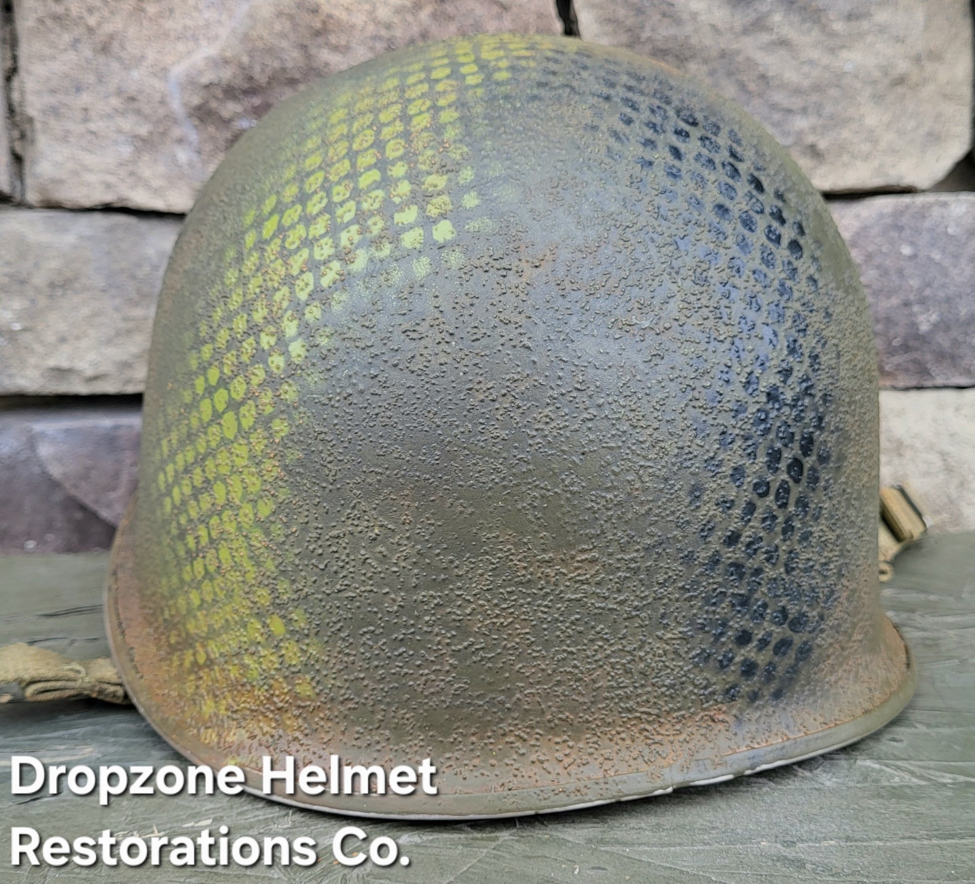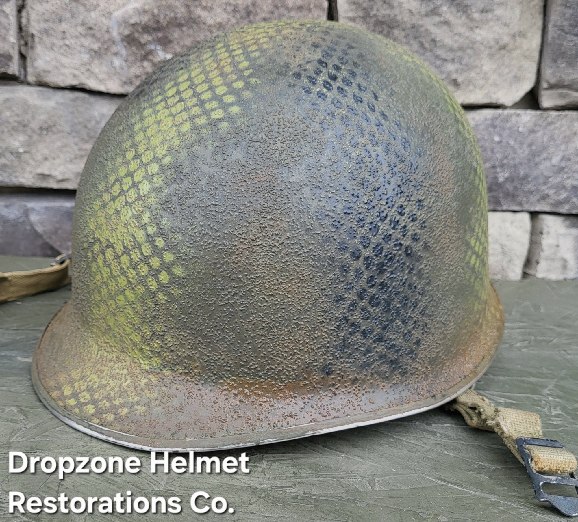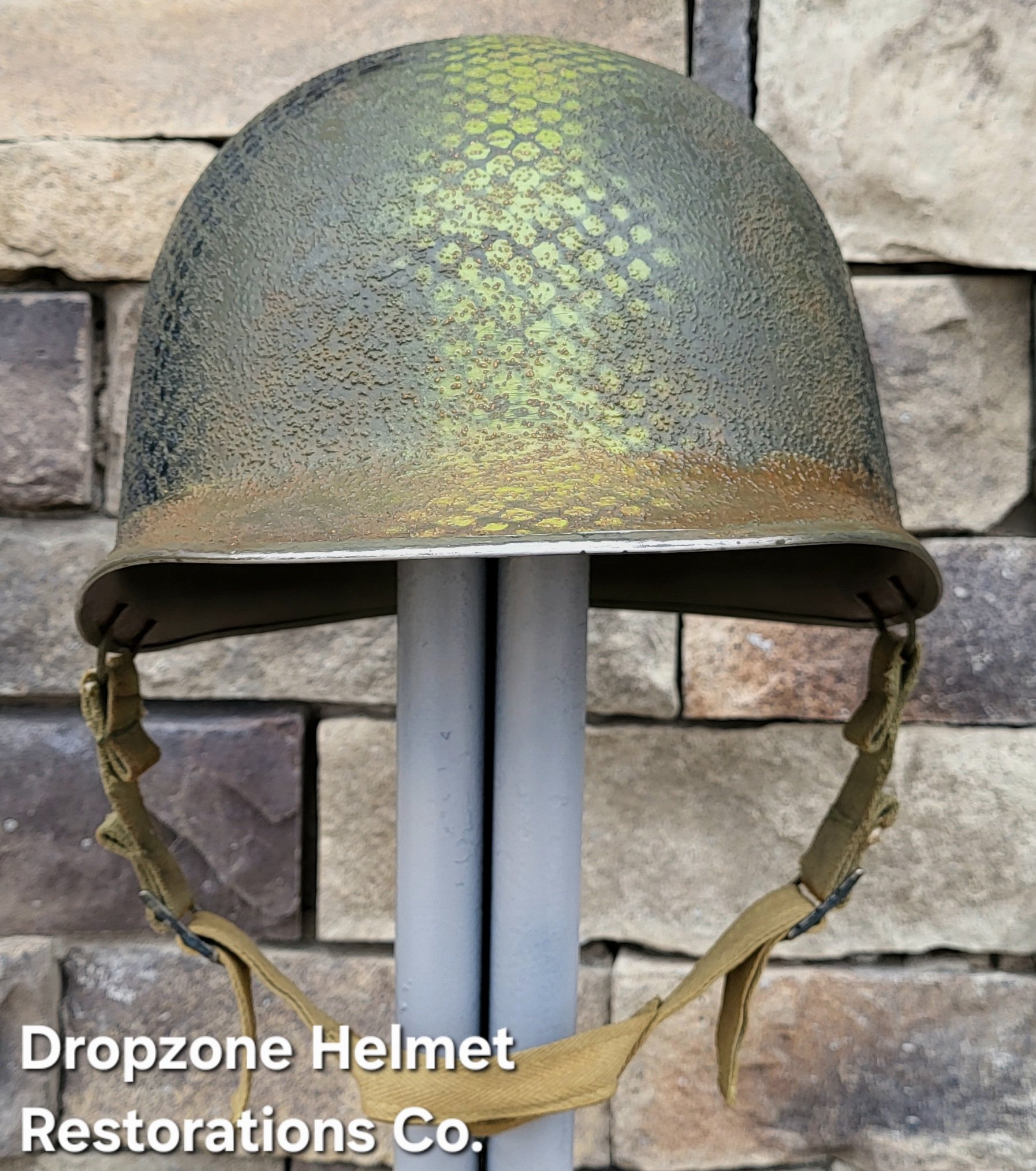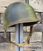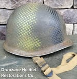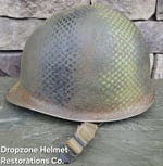 For your consideration is a Norwegian M1 style helmet that has been fully restored in the exact same fashion as all Dropzone Helmets are. New texture, OD paint, my own custom made 517th in-field made chinstraps. The Unique camo pattern of the 517th was sprayed over a vintage shrimp net, By Me, then aged & weathered for a "Combat Worn" appearance.