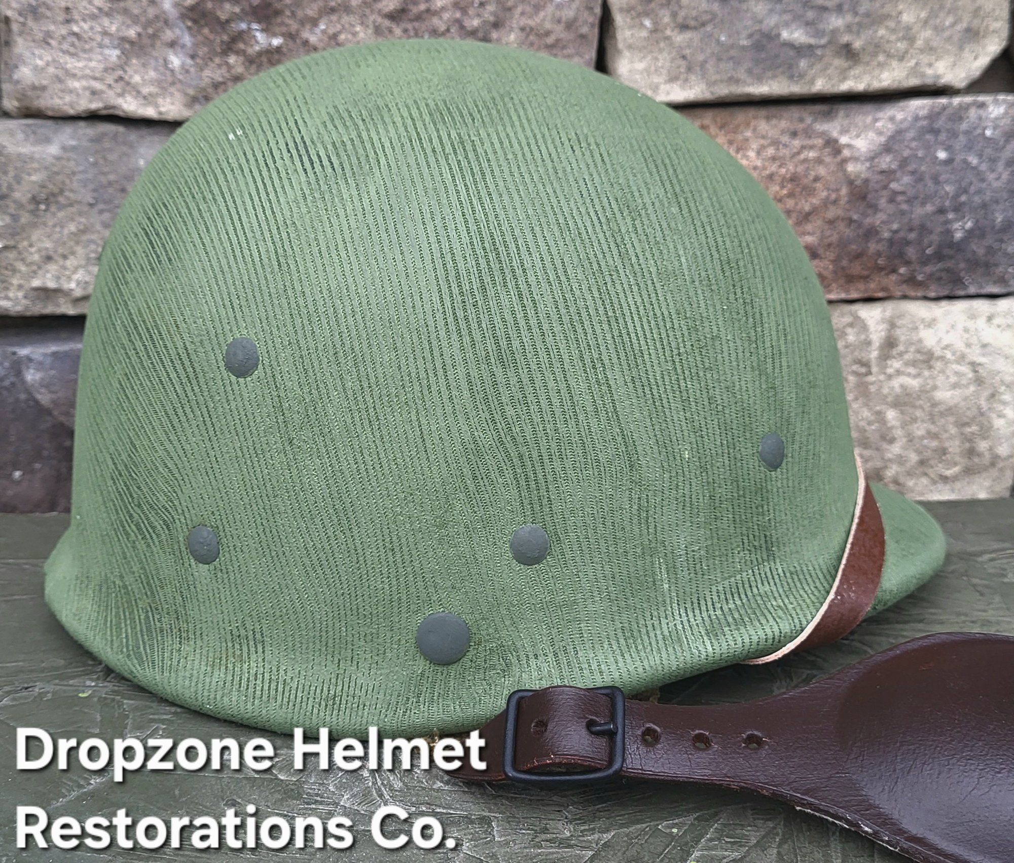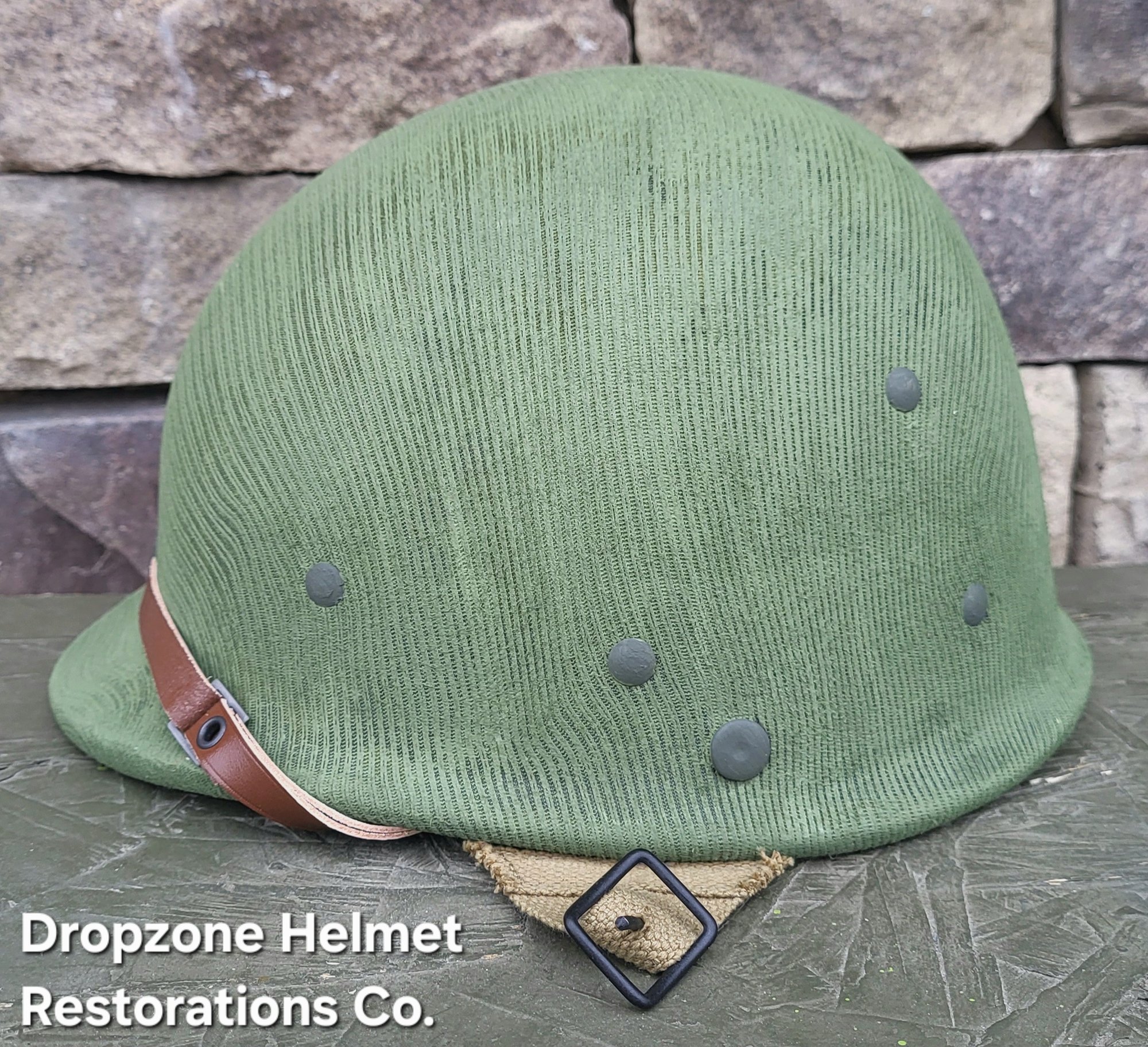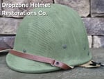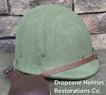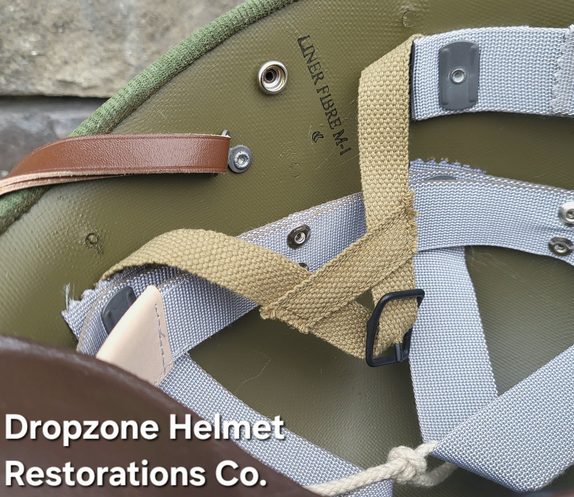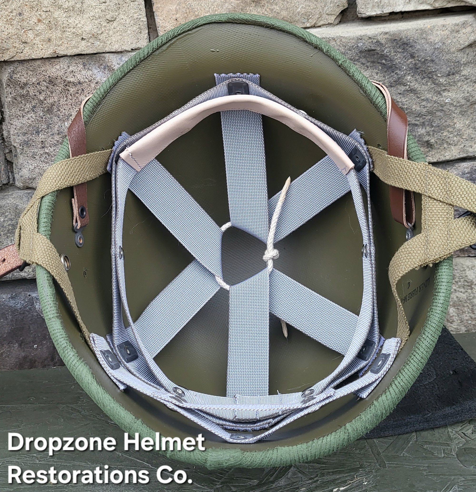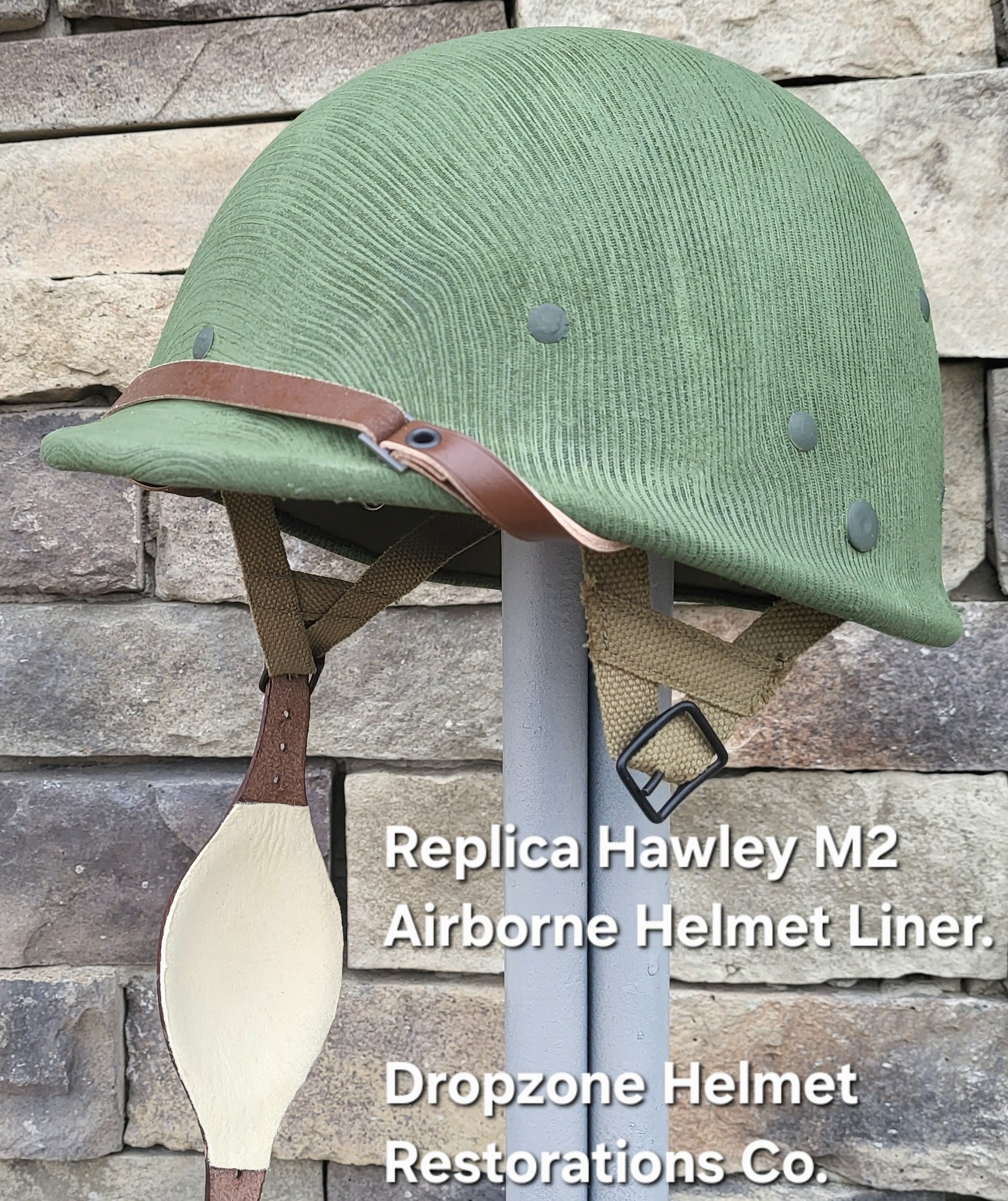 Repro WWII Hawley M-2 Airborne Helmet liner. Complete with Rayon webbing, fixed liner strap, Rayon sweatband and rayon nape strap. It is stamped "LINER FIBRE M-1" and a "G" in the crown. Rayon webbing Kit & fixed liner strap are from "Jmurrayinc1944.com". Imported chin-cups supplied by Jmurrayinc1944 with brand new chamois lining.