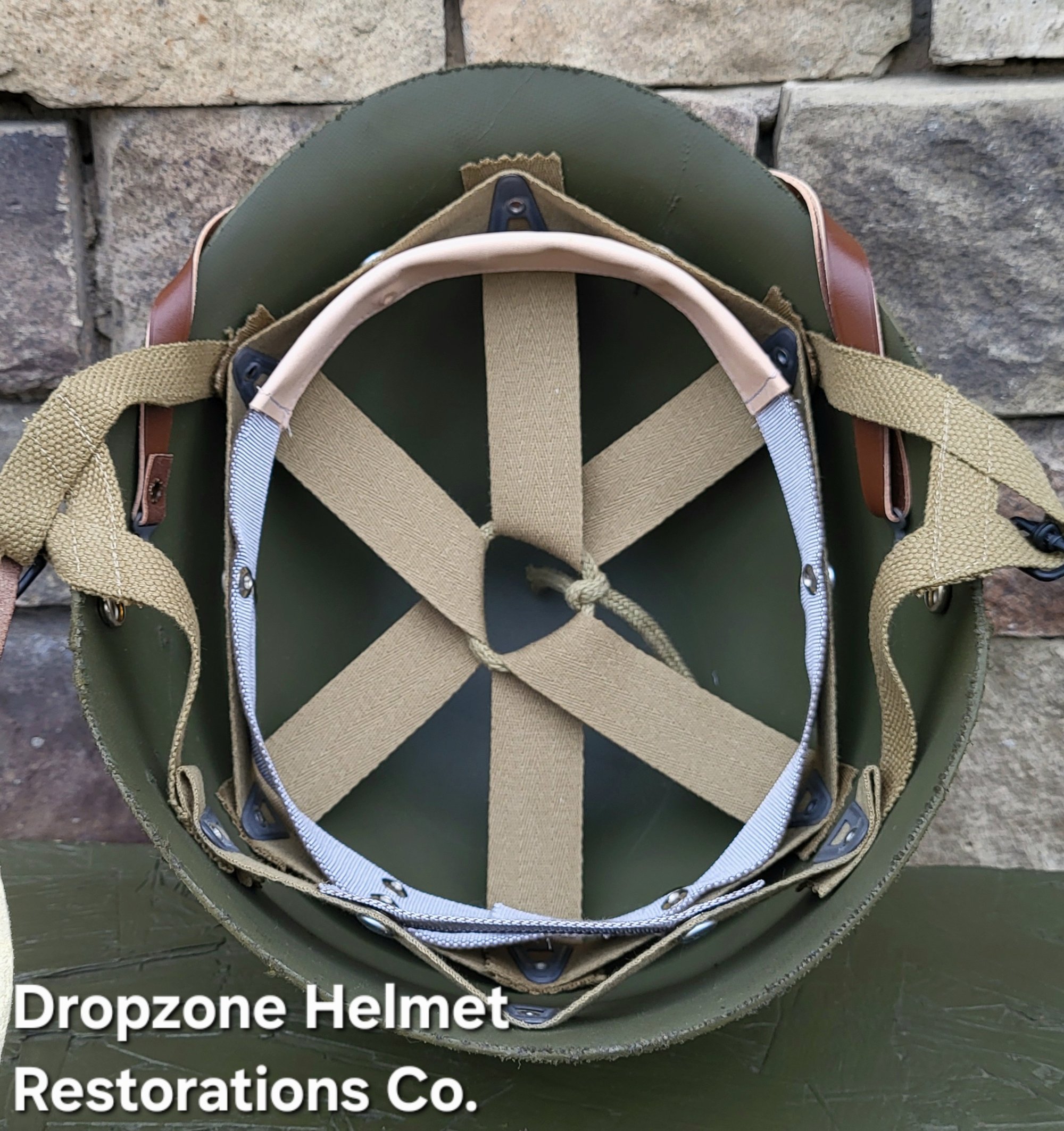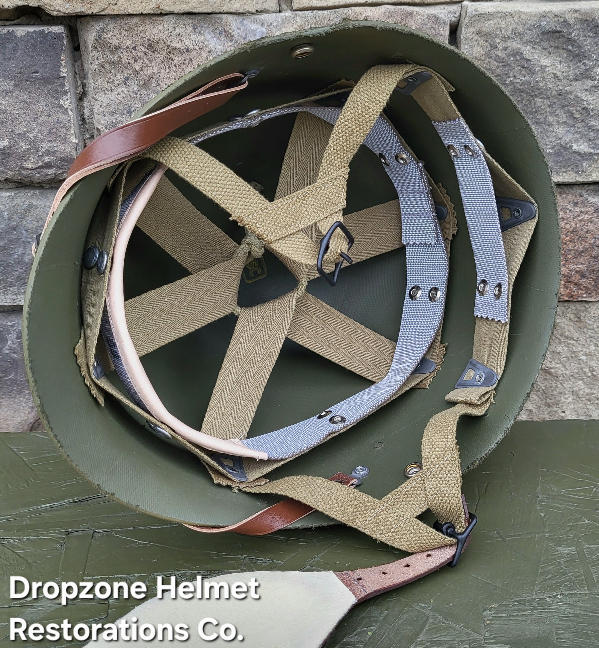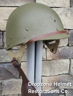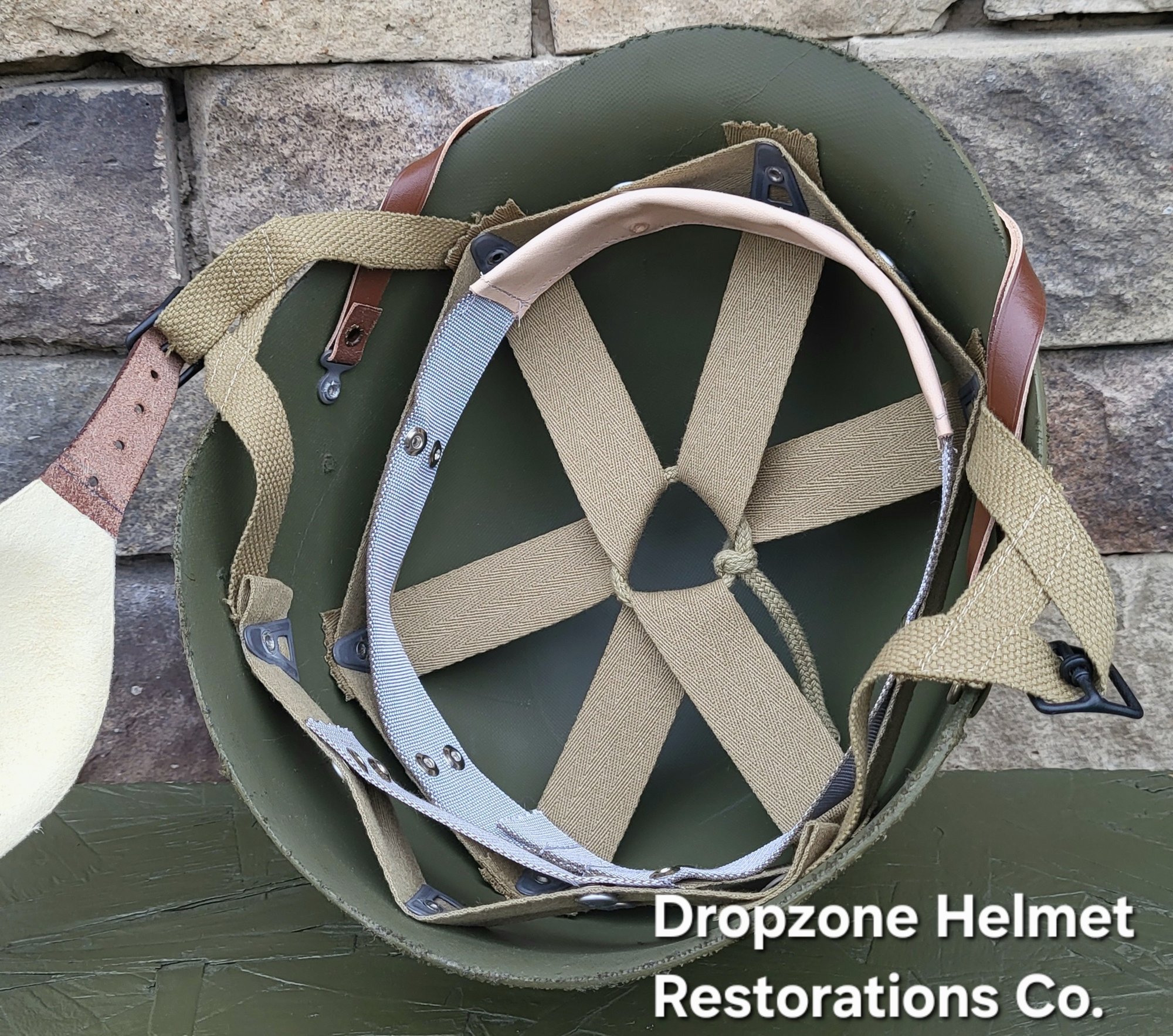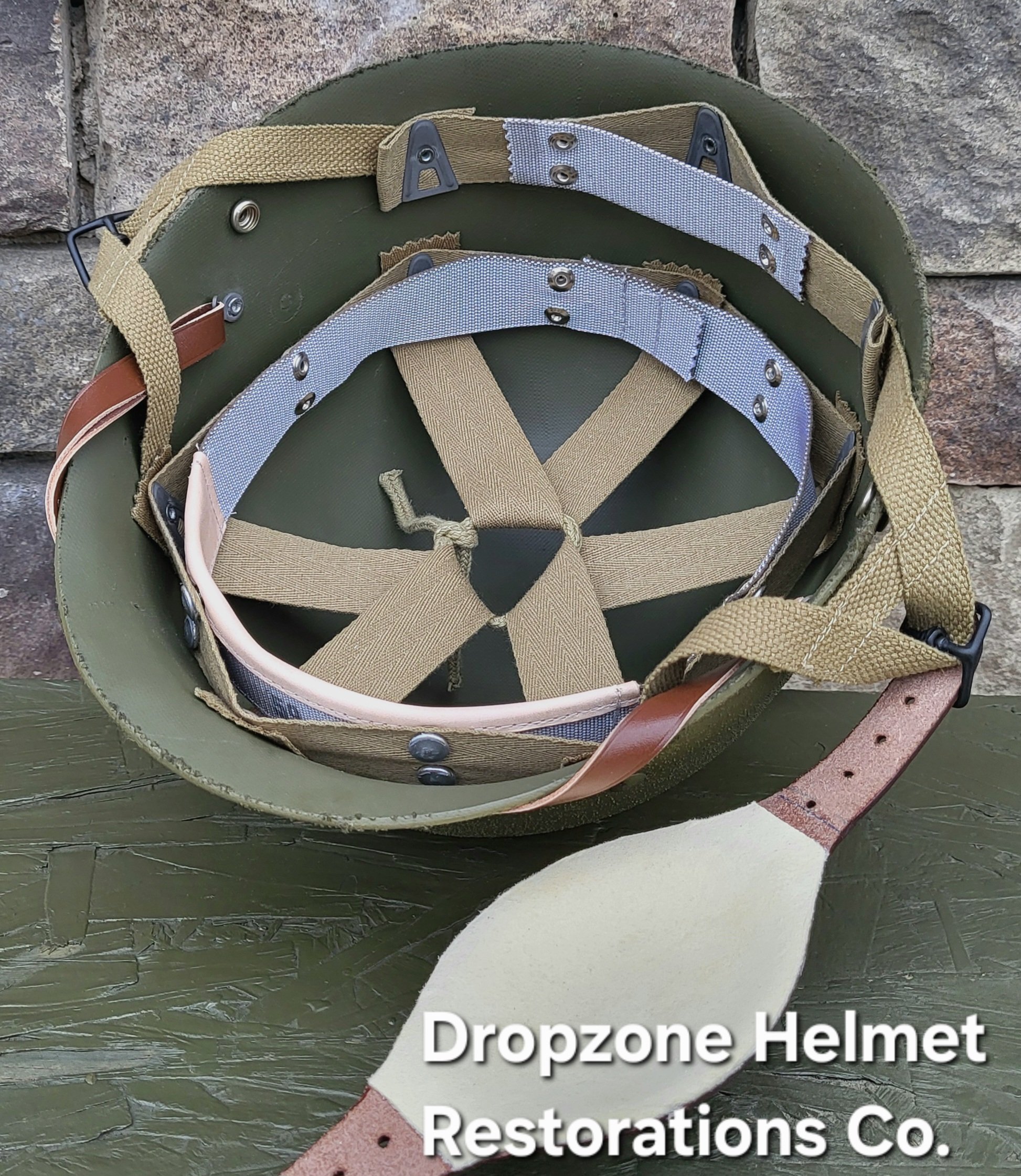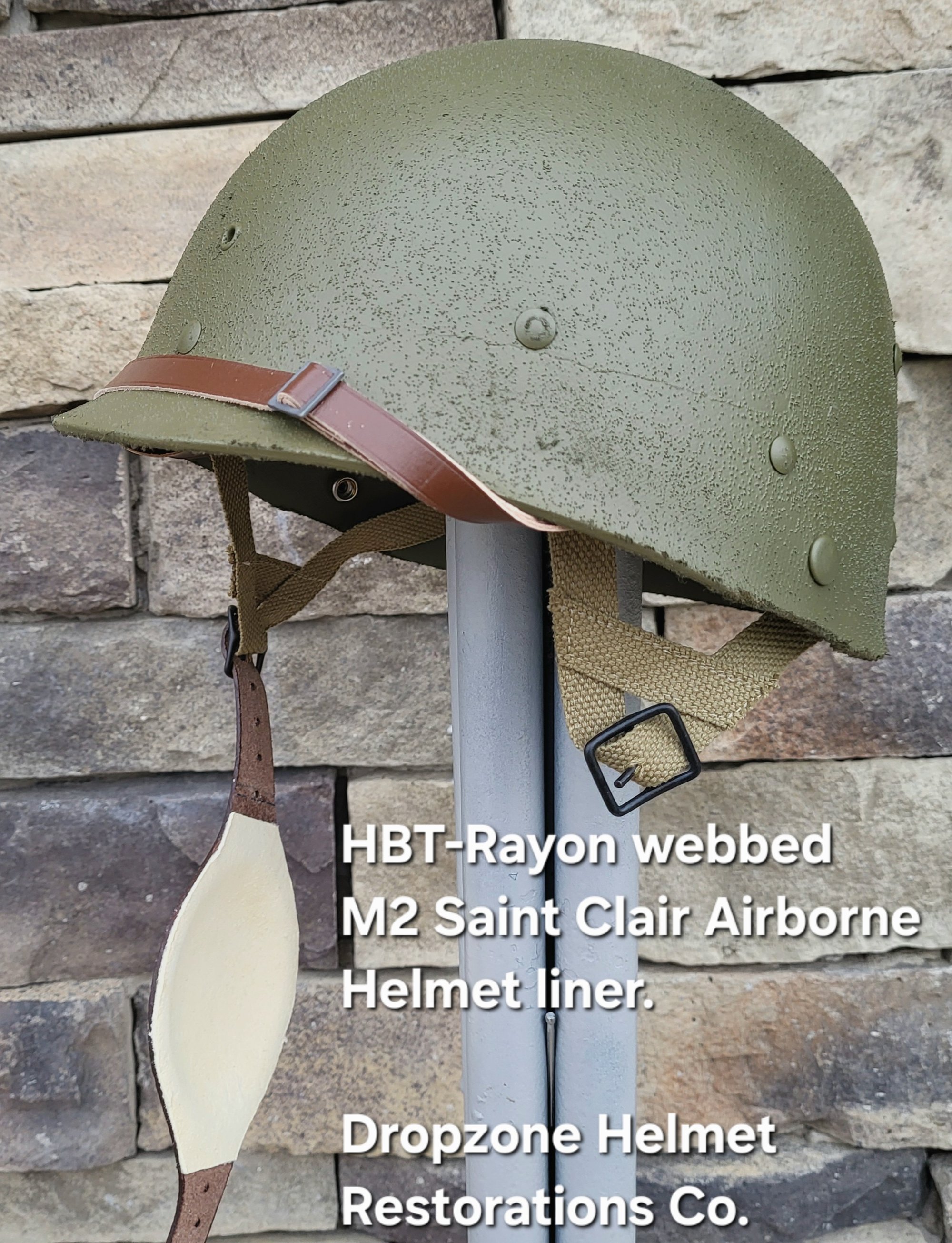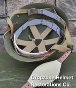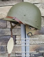 Repro WWII Saint Clair M2 Airborne Helmet liner. Complete with HBT & Rayon webbing, fixed liner strap, Rayon sweatband and rayon nape strap. It is stamped "LINER FIBRE M-1" and a "G" in the crown. Rayon webbing & fixed liner strap are from "Jmurrayinc1944.com".