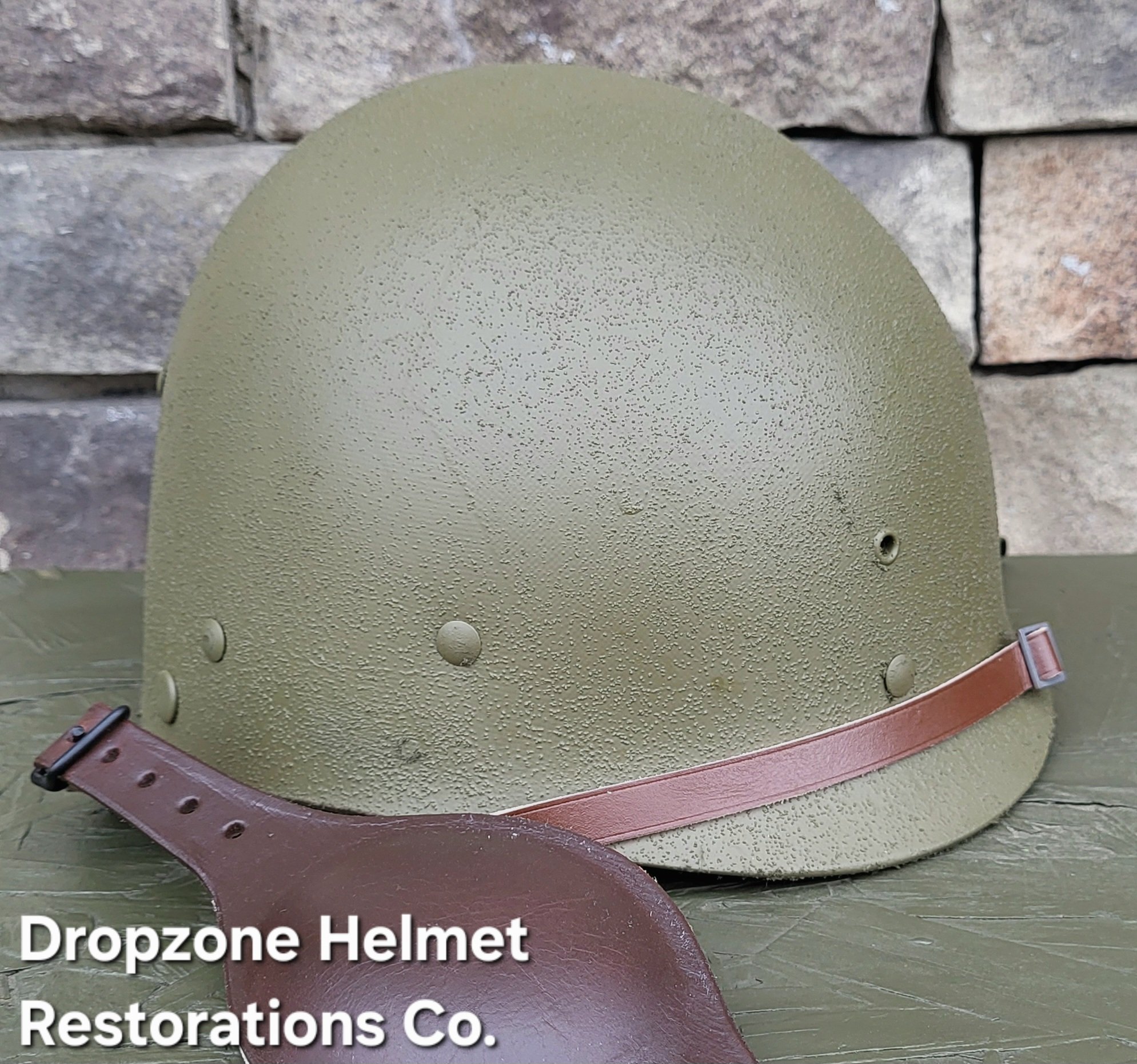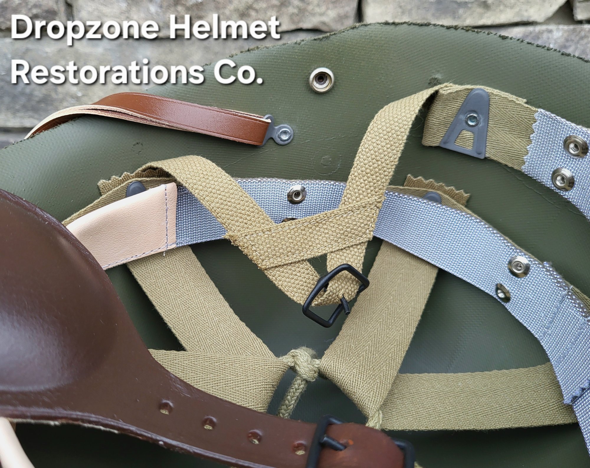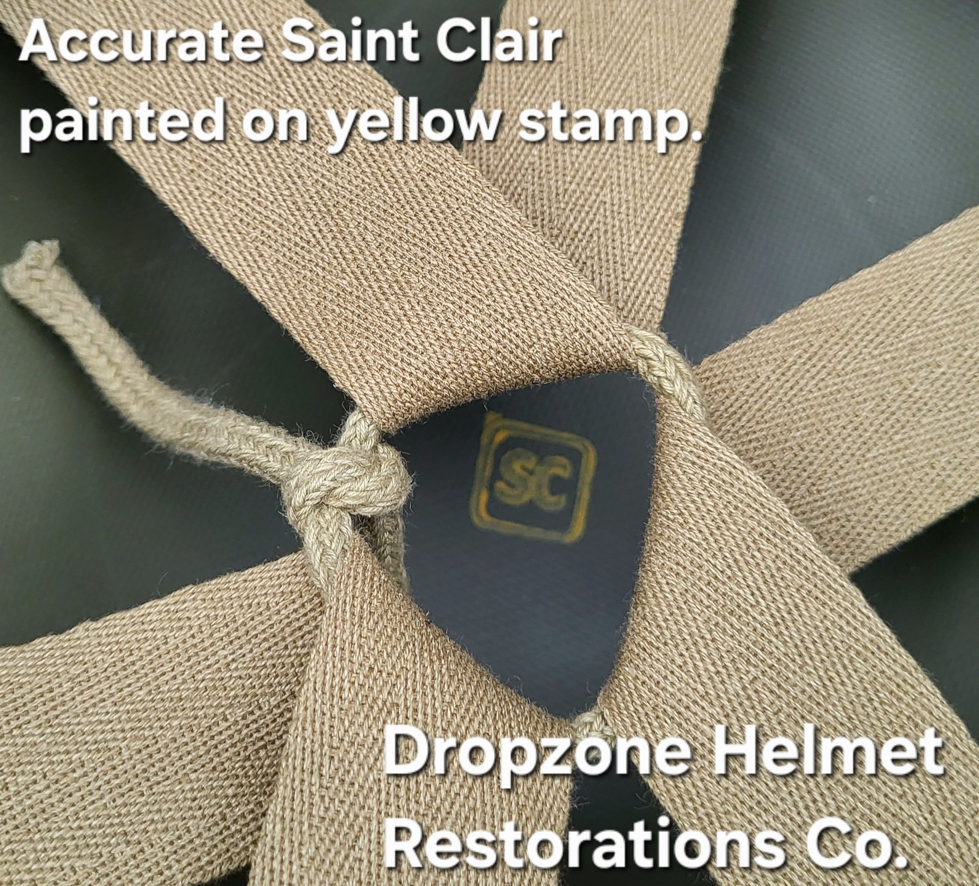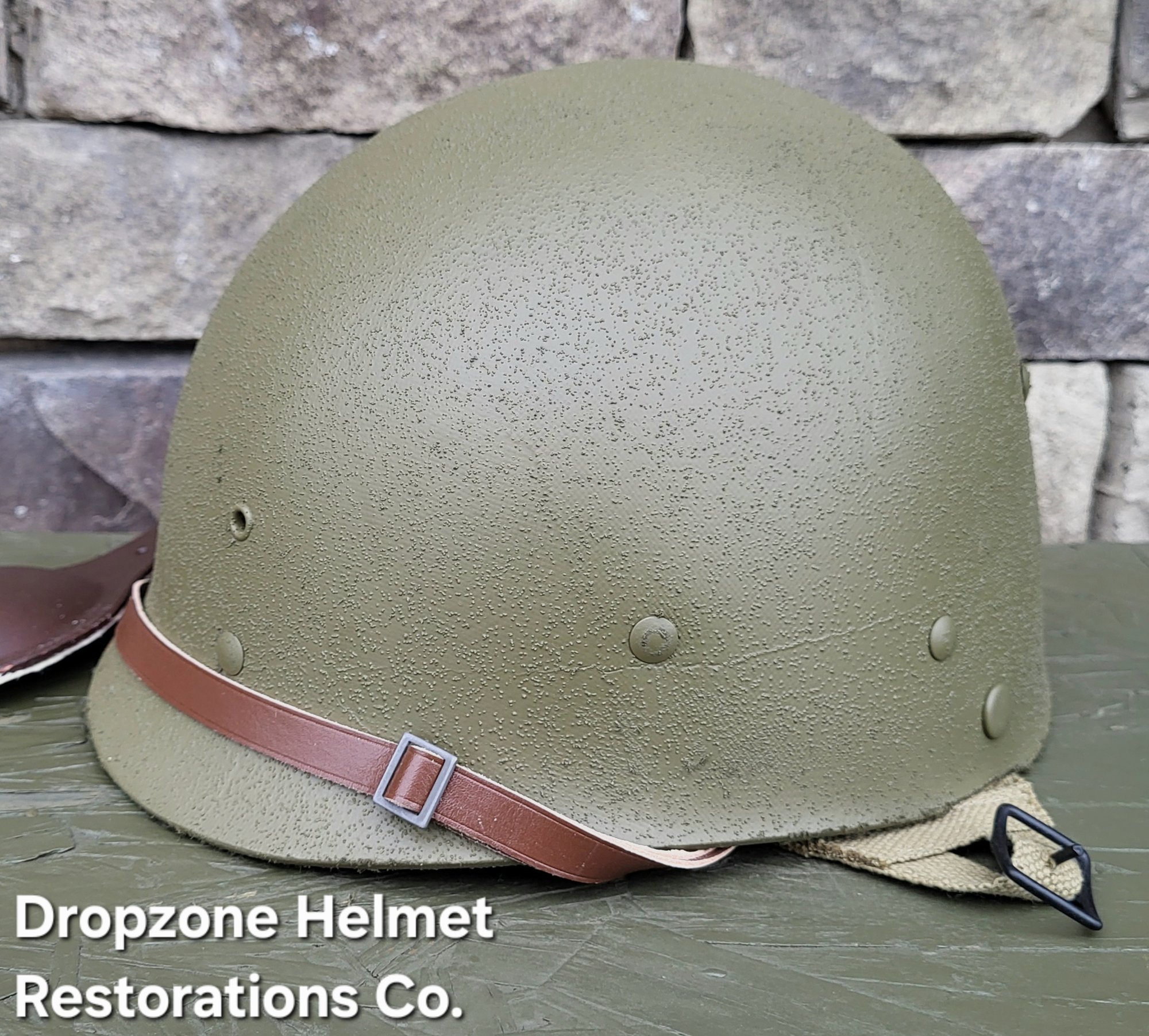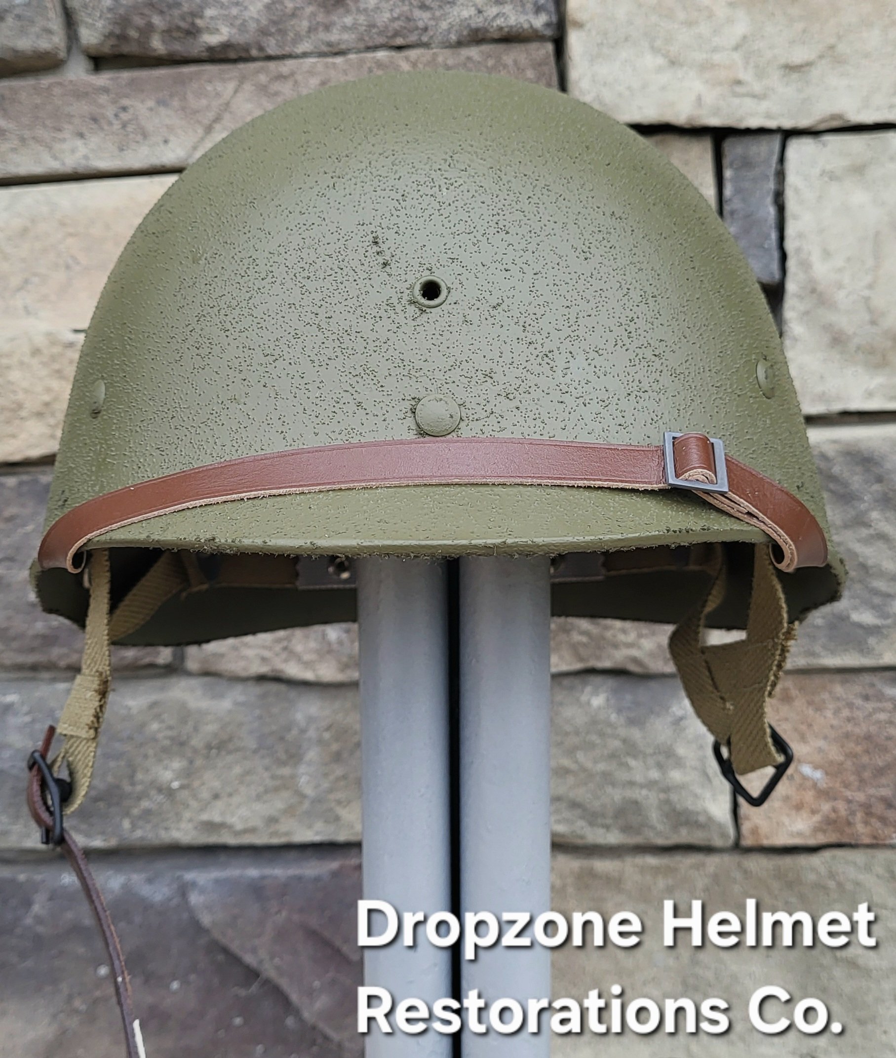Repro WWII Saint Clair M2 Airborne Helmet liner. Complete with HBT & Rayon webbing, fixed liner strap, Rayon sweatband and rayon nape strap. It is stamped "LINER FIBRE M-1" and a "G" in the crown. Rayon webbing & fixed liner strap are from "Jmurrayinc1944.com".