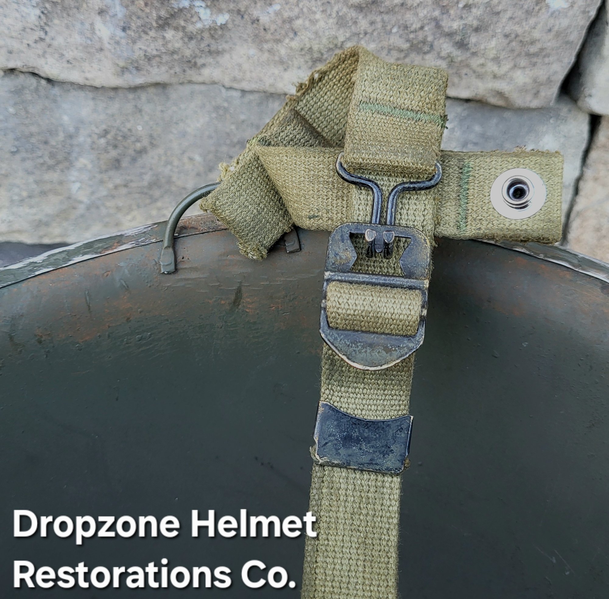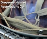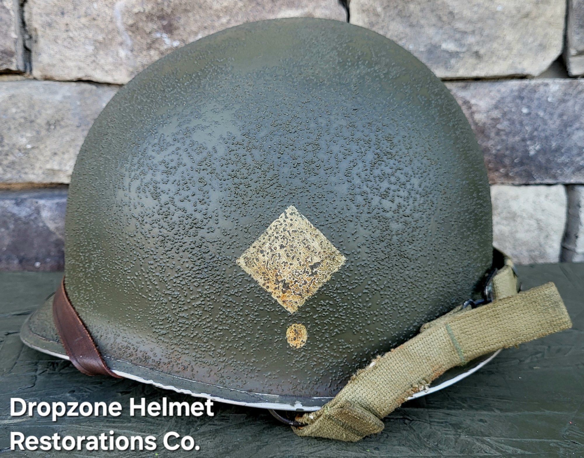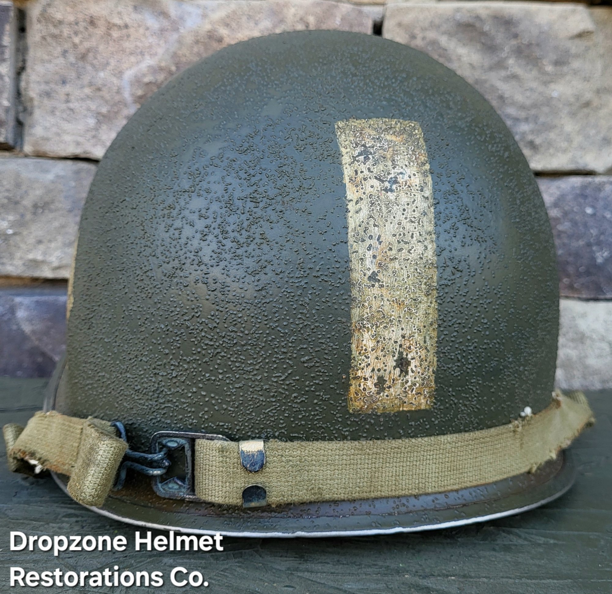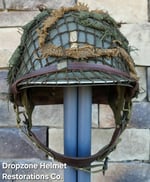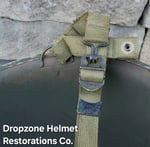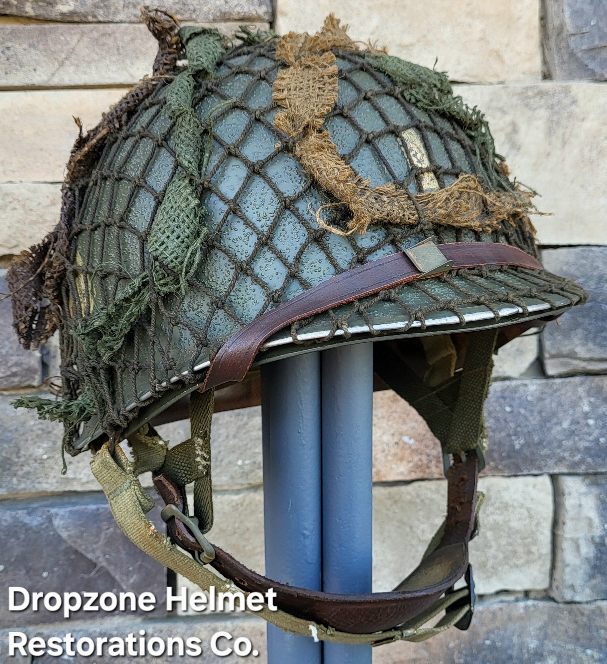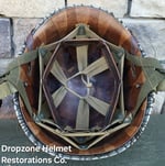 LINER: This Westinghouse liner has been restored as an Airborne model. HBT webbing, A-washers, nape strap, tie-string, sweatband, A-yokes w/wire buckles & liner chinstrap plus leather chincup are highly detailed/aged repro's. The drawstring helmet net & burlap scrim are included!