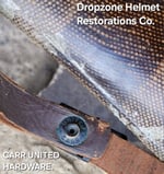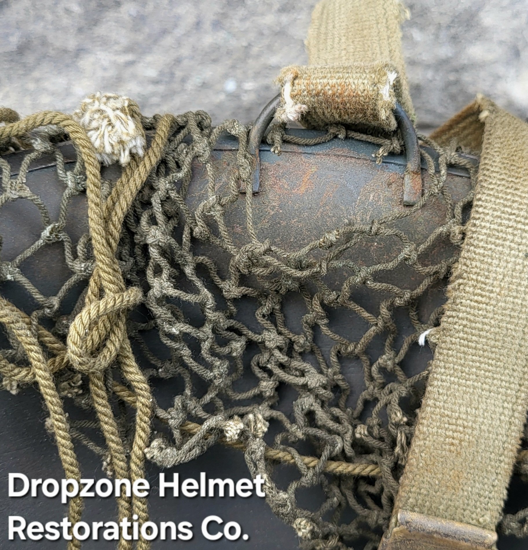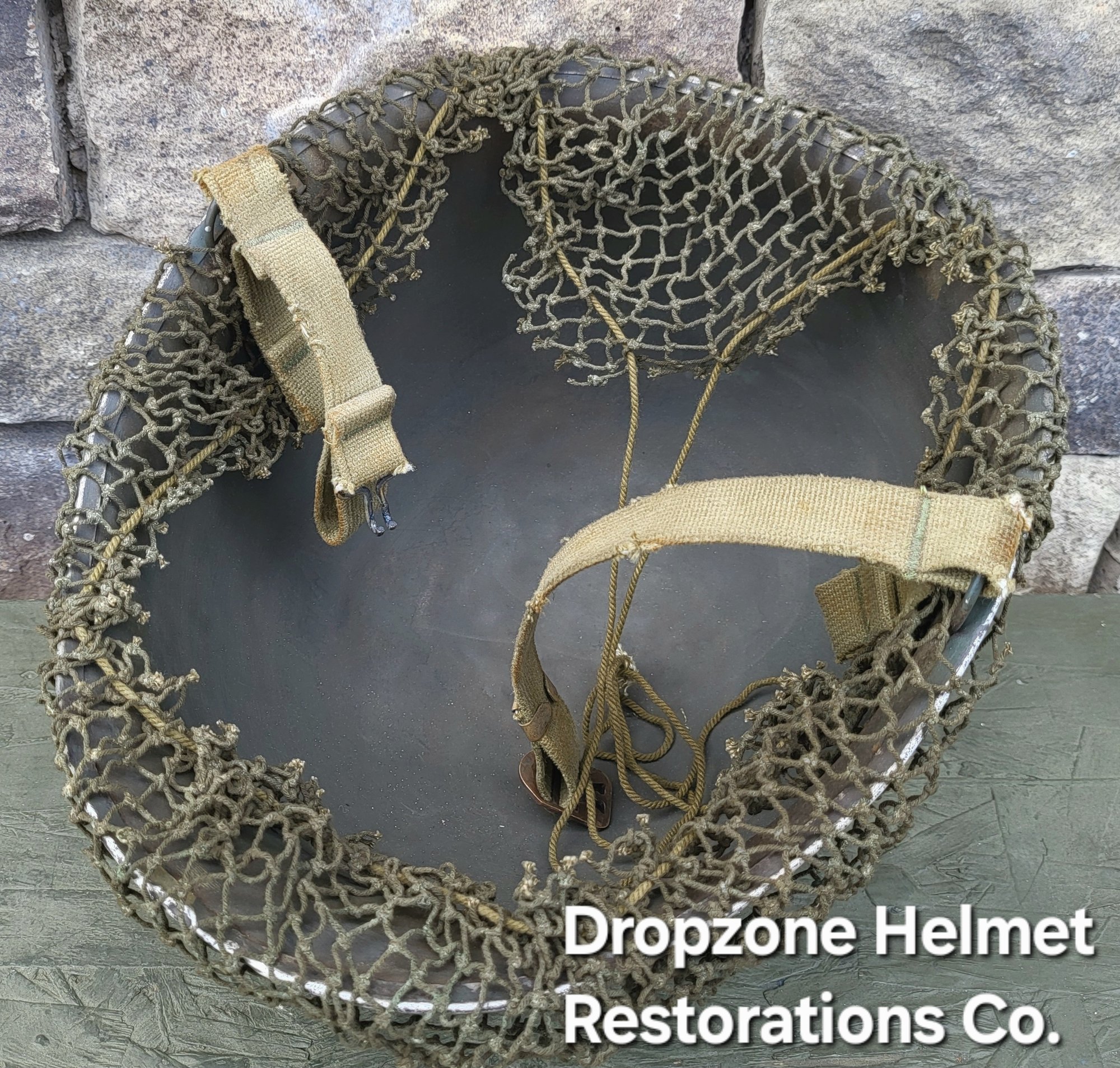 HELMET LINER: This is an actual/authentic/genuine WWII Era Westinghouse paratrooper liner. The liner has been restored using both original & premium aged/weathered parts. The A-yokes & chincup are aged repro's. (The remains of the original A-yokes & rivets will be included.)